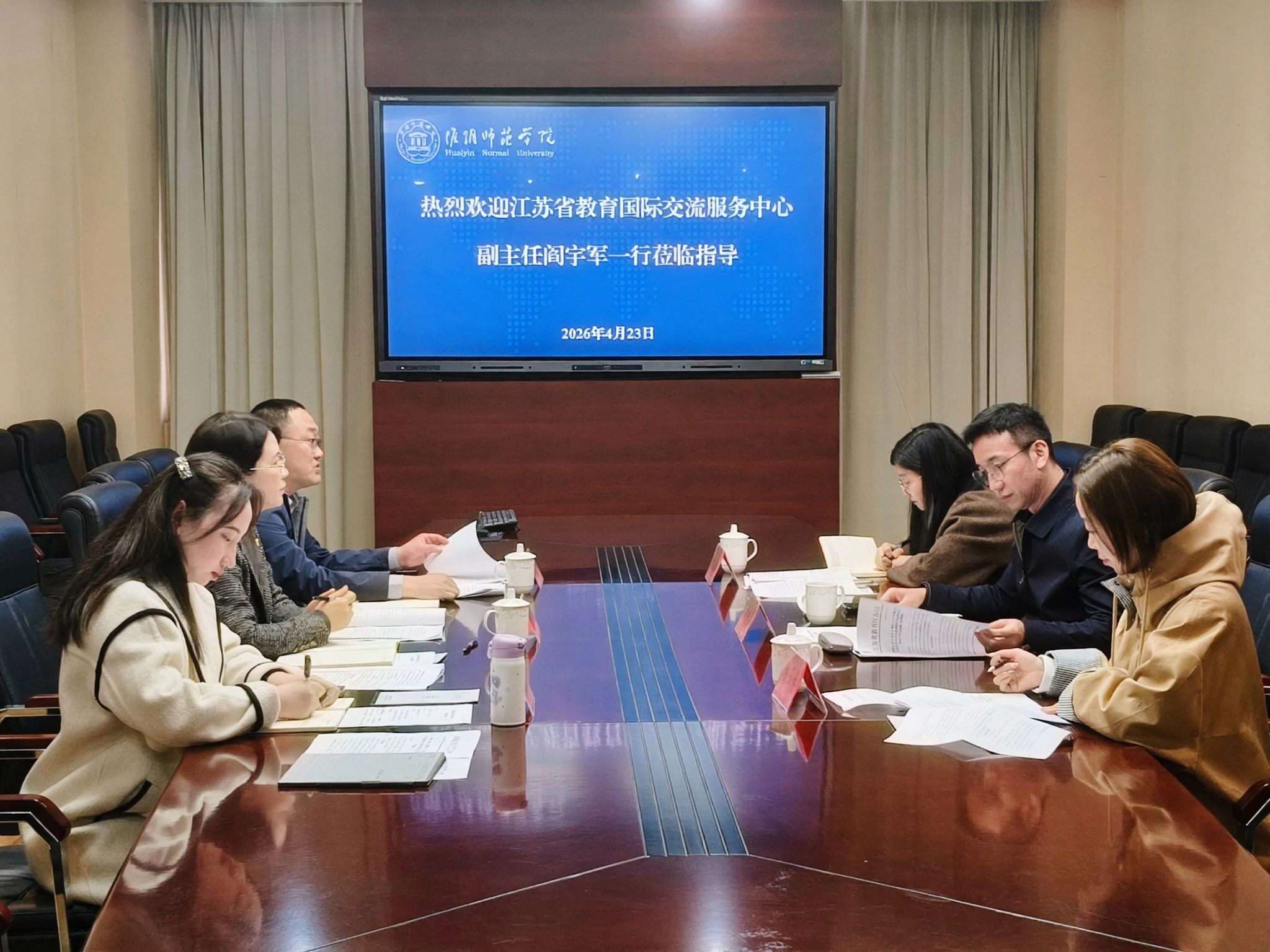 4月23日上午,省教育国际交流服务中心副主任阎宇军一行来淮阴师范学院开展“鲲鹏计划”项目专题调研。我校国际合作与交流处处长刘芳、教务处副处长臧庆佩及相关科室负责人接待来宾并参与交流。